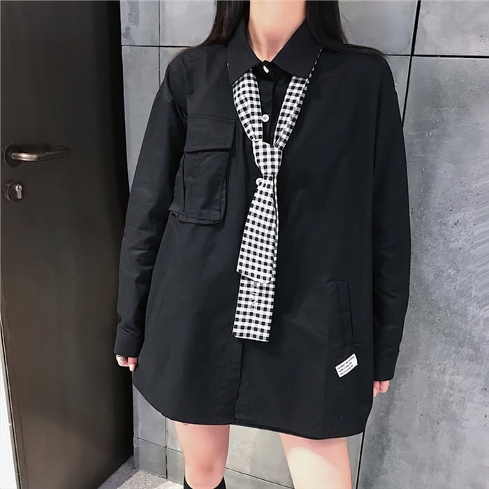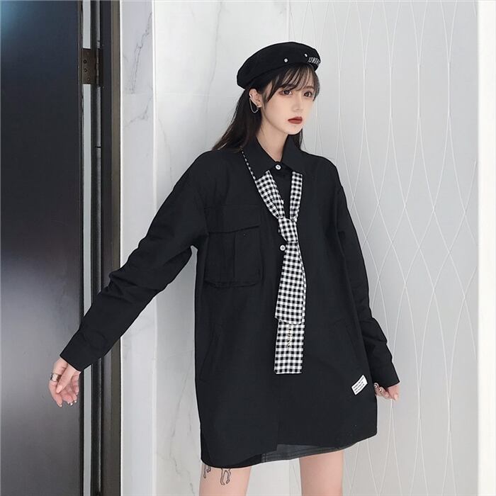サブカル 服 地雷系 通販 ゴスロリ レトロ シャツ 格子柄ネクタイ 長袖 ビッグシルエット 闇かわいい ブラック モード系 オルチャン