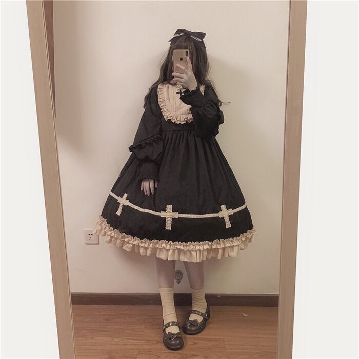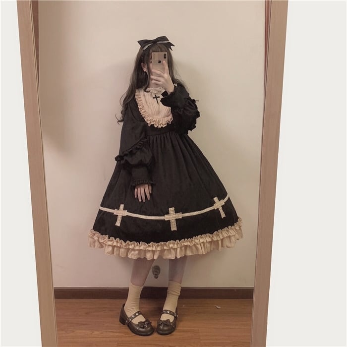 サブカル 服 地雷系 通販 ロリータ クラロリ ワンピース 長袖 ネックギャザー 十字架 かわいい 袖コン フリル レース