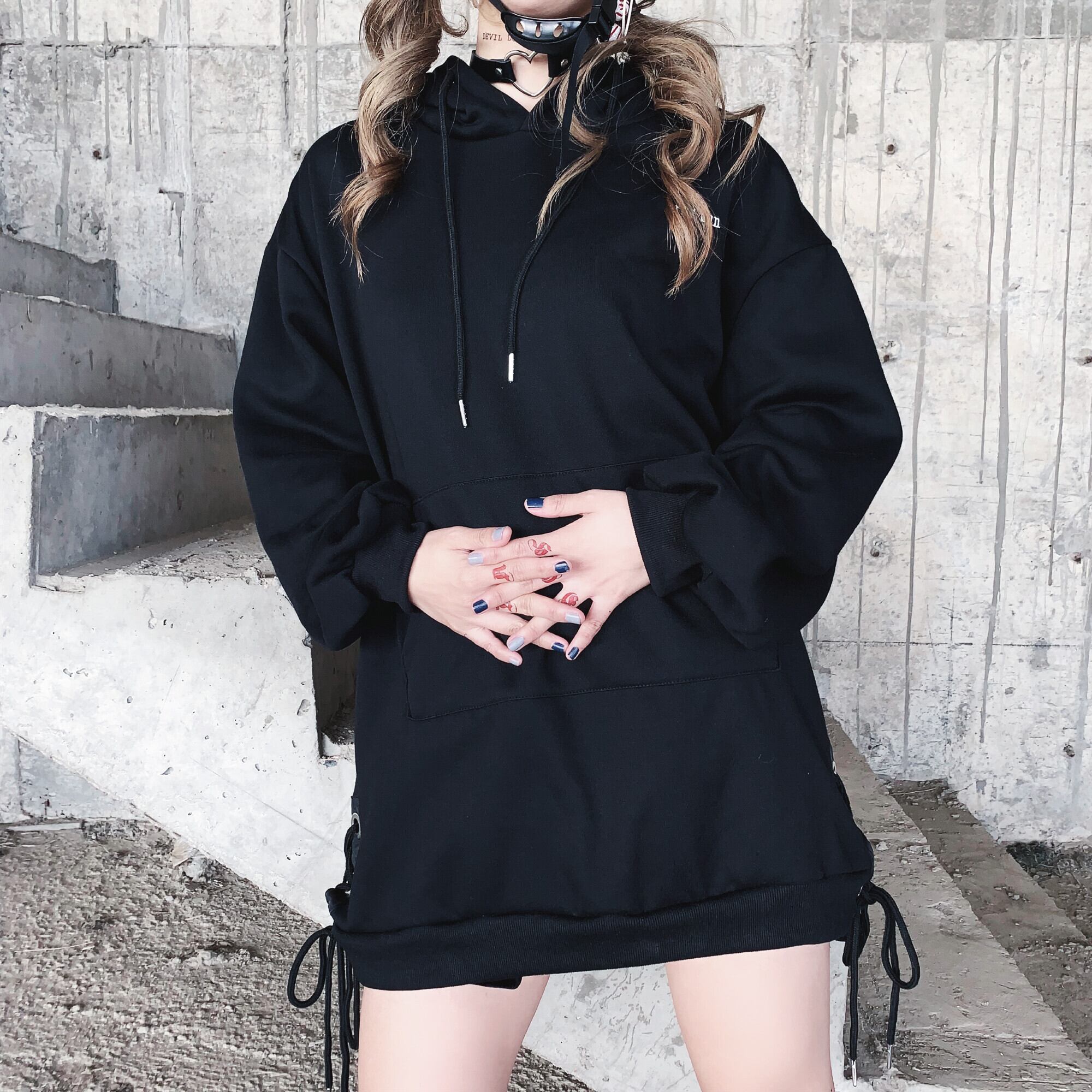 サブカル 服 地雷系 通販 パーカー ビッグシルエット サイドクロス 編み上げ ゴシック カジュアル ブラック ワンサイズ
