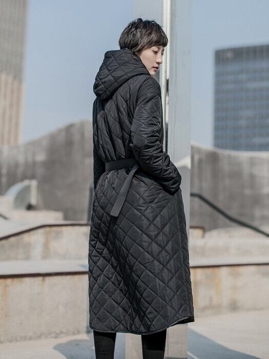 コットンを使った贅沢な中綿キルティングコート。シックなブラックなので、オン・オフ問わずコーディネートしやすい万能選手です。コートを着ていてもウエストベルトがさりげなくハイウエストを演出してくれます。