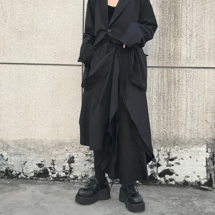 アシンメトリーなロング丈スカートのシルエットが闇深い巾着スカートです。黒シャツとコーデしてモード系としてもおすすめのアイテムです。