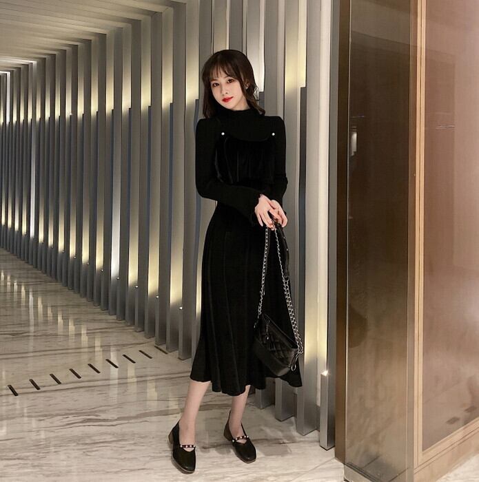 サブカル 服 地雷系 通販 ゴスロリ 黒 ツーピース 長袖 ロング丈 ベルベット 上品 大人可愛い モード系 20代 30代
