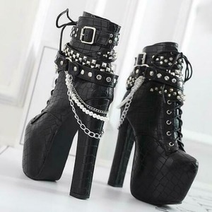 ヒール高16.0cmの超ハイヒールにスタッズをまとったダブルベルトが病み可愛いインパクト抜群のハイカットブーティです。人気のハイカットなので軽量で歩きやすいブーツです。スキニーとコーデして足長効果はもちろん美脚シルエットも叶えてくれる優秀アイテムです。ヒール高16.0cm つま先高7.0cmです。