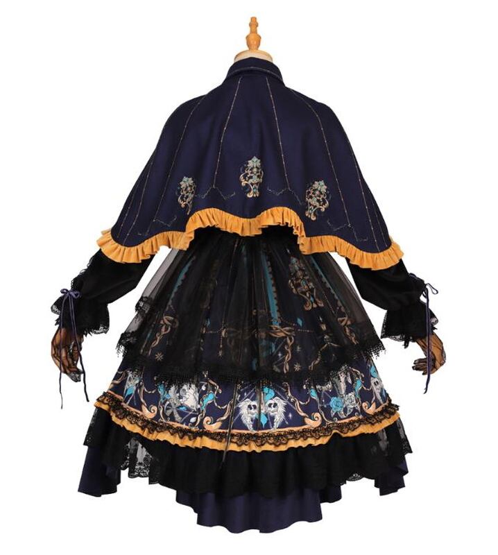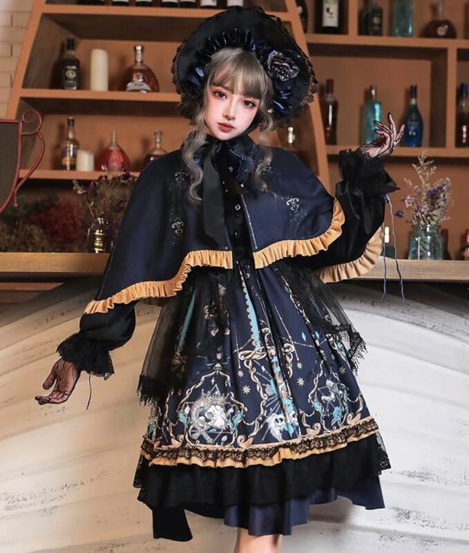 病み可愛い本格的な甘ロリワンピです。甘めの星座プリント柄にブラックレースのレイヤースカート、フリルで縁取られたショールケープが病み可愛さをプラス。