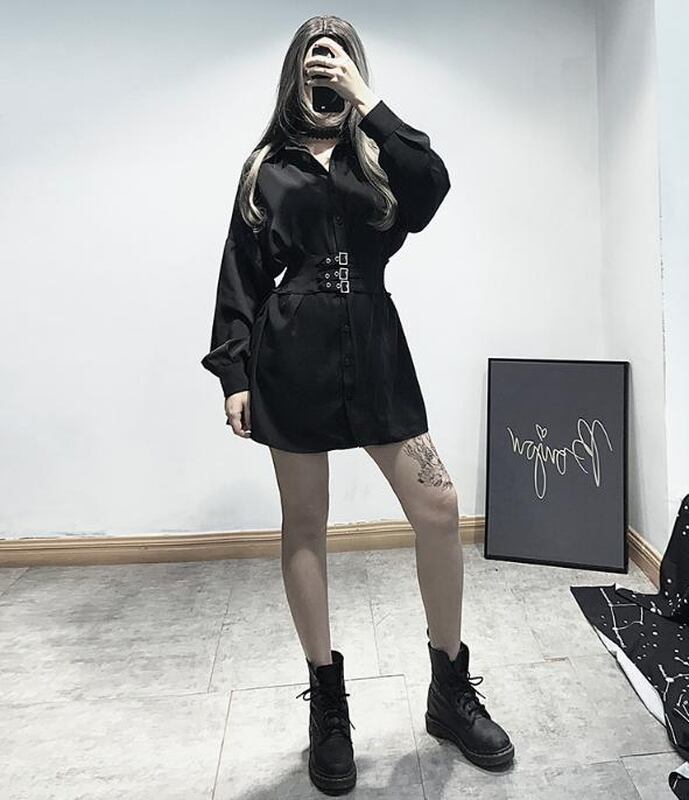 サブカル 服 地雷系 通販 ゴスロリ シャツワンピ ベルト付き ミニ丈 3連ベルト 闇かわいい ハードガール 黒コーデ ゴシック