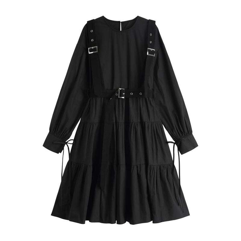 ビジュアル抜群なストラップベルトが病み可愛いブラックワンピです。幅広なストラップベルトが腰高なウエストマークをメイクして病み可愛いAラインシルエットを演出してくれます。