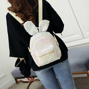 きらきら輝くスパンコールのうさぎ耳がかわいいバックパックです。iPadが収容できる大容量、スマホ収容にも便利なサイドポケット付きです。 通学用としてオフの休日のお出掛け用としてもさり気なく可愛さを叶えてくれます。カラーは5種類、お友達と色違いもおすすめです。こちらは日本未販売のオリジナルデザインのプライベートブランドです。