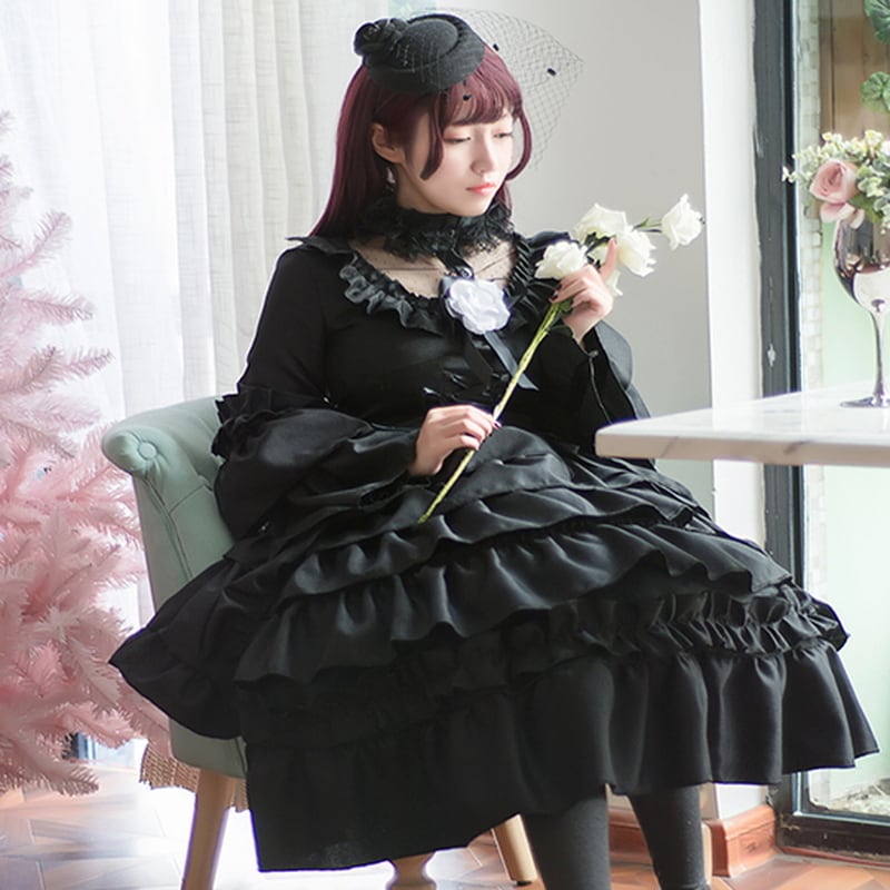 サブカル 服 地雷系 通販 ゴスロリ 闇かわいい ワンピース 黒ロリィタ 袖コン ベール付ハット ケーキスカート レース フリル 豪華 上品 ゴシック ロリータ