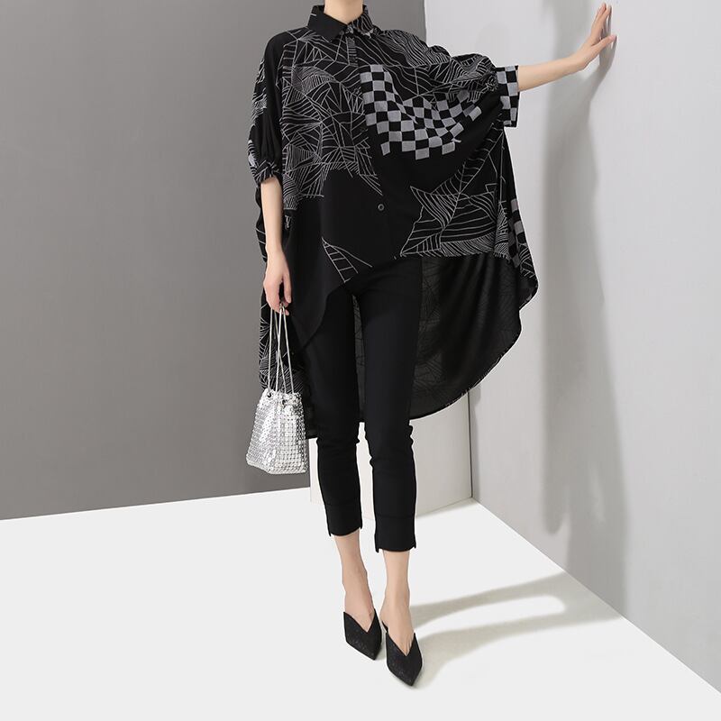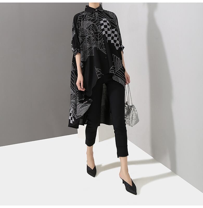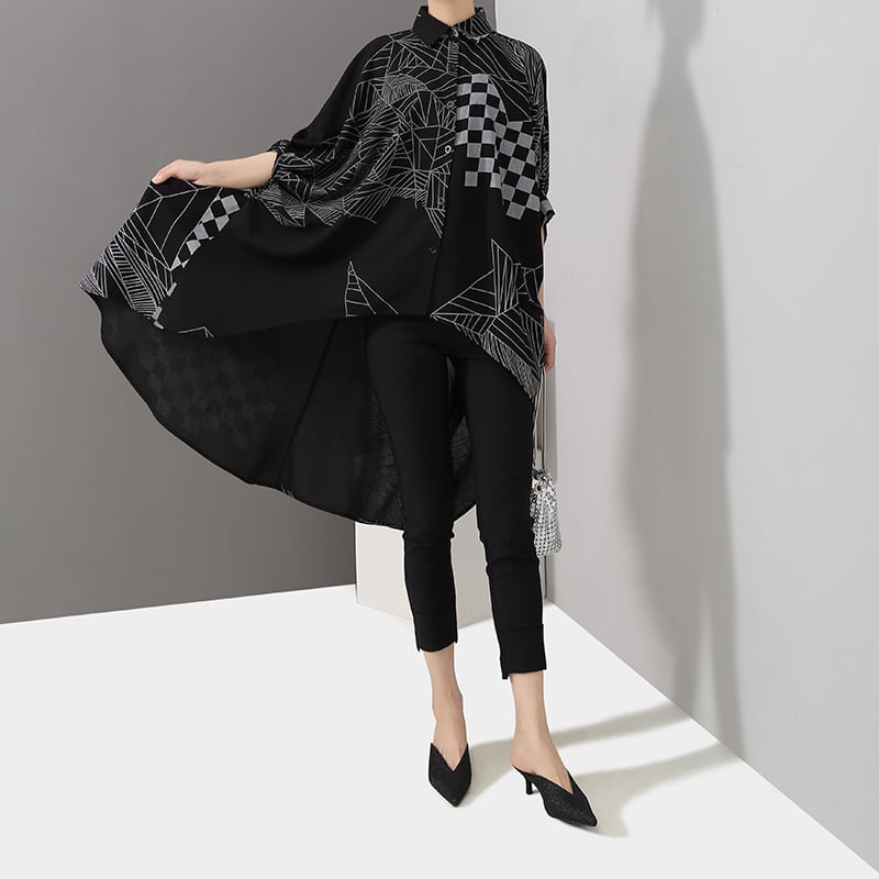 サブカル 服 地雷系 通販 モード系 ロング丈 シャツ アシンメトリー 幾何学プリント 黒コーデ ゴシック 大人きれいめ 20代 30代