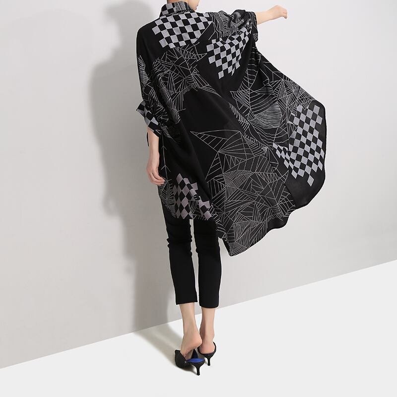 シャツワンピのように着用出来る幾何学模様が印象的な黒シャツです。