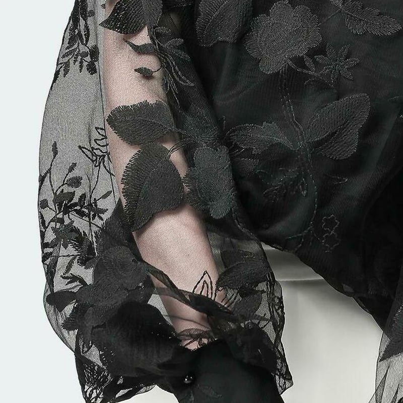 ボタニカルな花柄刺繍があしらわれ、トップの大きな花柄が大人きれいめなブラウスです。ショルダースリーブはセクシーな透け感たっぷりなバルーンスリーブ。