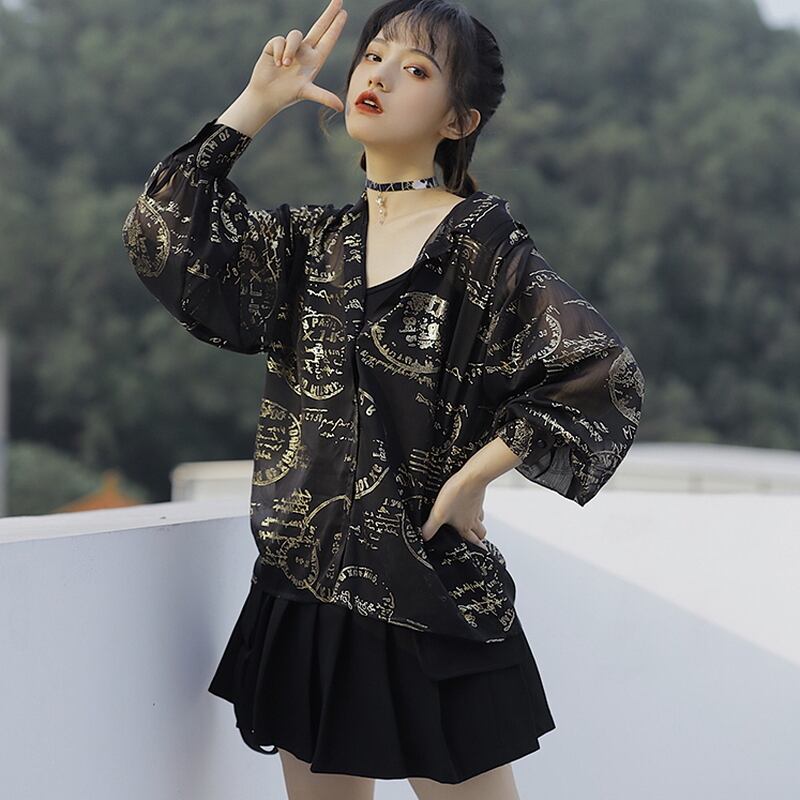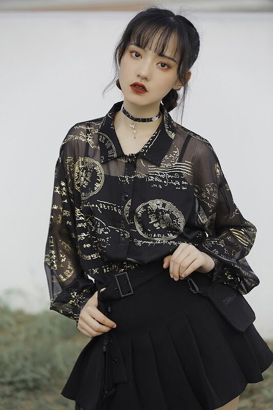 黒の長袖にレトロなゴールドが病み可愛い長袖シフォンシャツです。