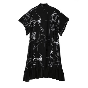 ブラックに手書きのようなラインデザイン柄、シルエットはアシンメトリーなレースフリルの切替えが大人きれいめでセクシーさをプラスしたシャツワンピです。