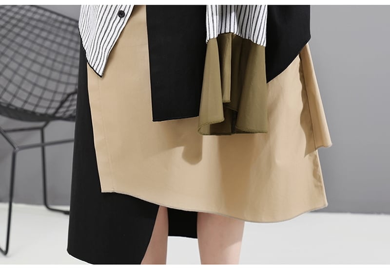 ブラックをベースにストライプやライトブラウン、カーキ色など落ち着きのカラーをドッキングしたティアードスカートです。レイヤードされた立体的なシルエットがスカートに躍動感を与え、ヘルシーな印象を叶えてくれます。