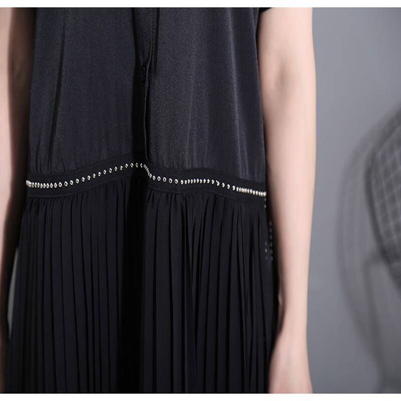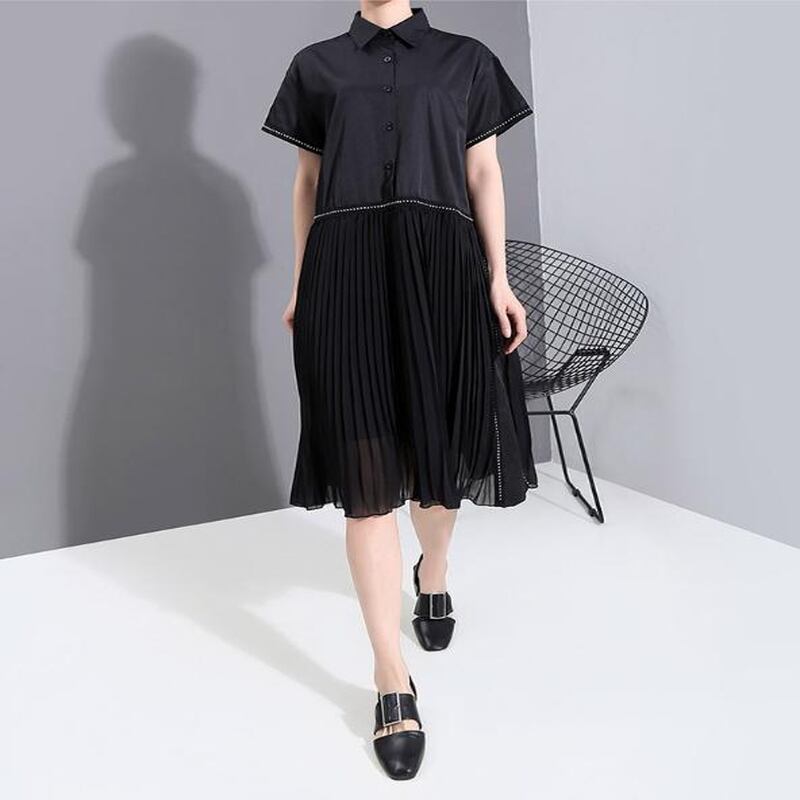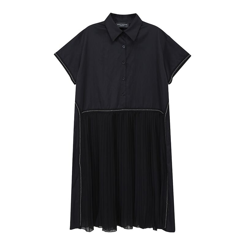 黒シャツにプリーツスカートがドッキングしたようなシルエット、スカートは透け感のあるプリーツスカートでセクシーさをプラス。きれいめな大人女性を演出してくれるデザインが魅力的なシャツワンピです。