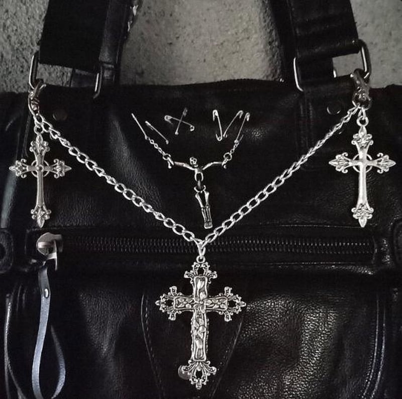 病み可愛い三連シルバー十字架がビジュアルインパクト抜群なショルダーバッグです。