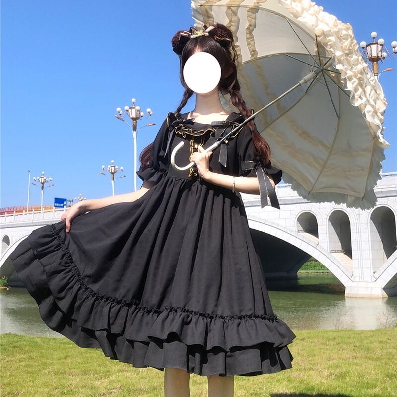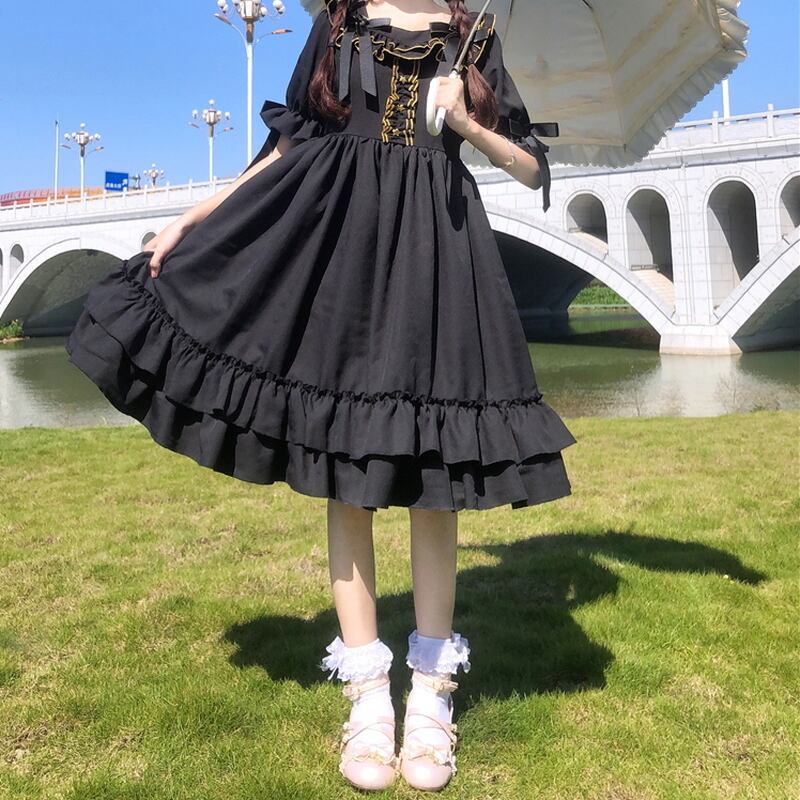 サブカル 服 地雷系 通販 ロリータ ワンピース 半袖 リボン フリル ロリィタ ハイウエスト 闇かわいい Aライン 袖フリル 甘め ゴシック
