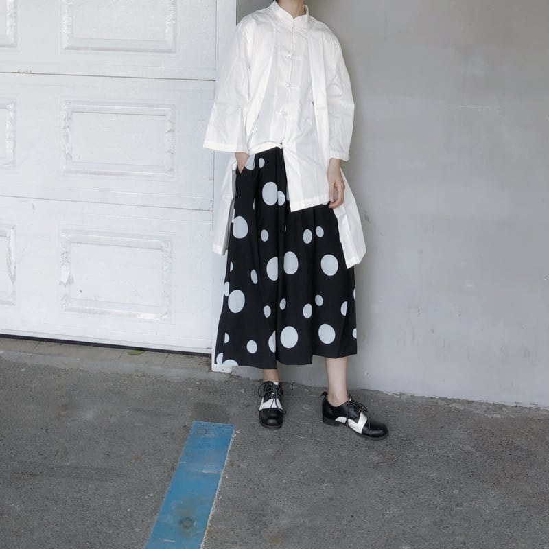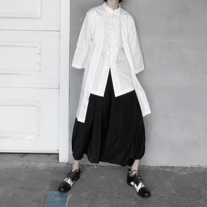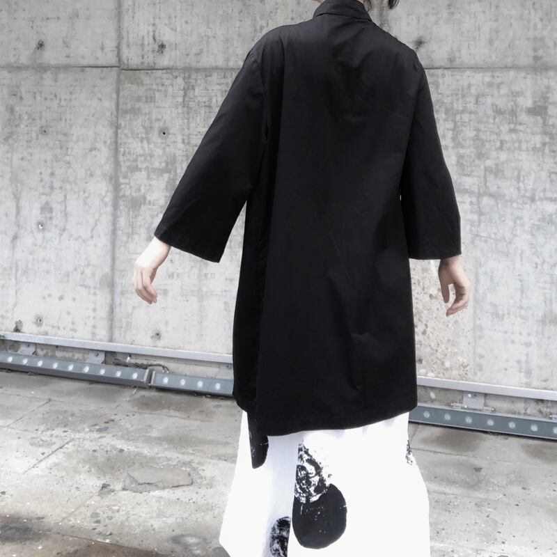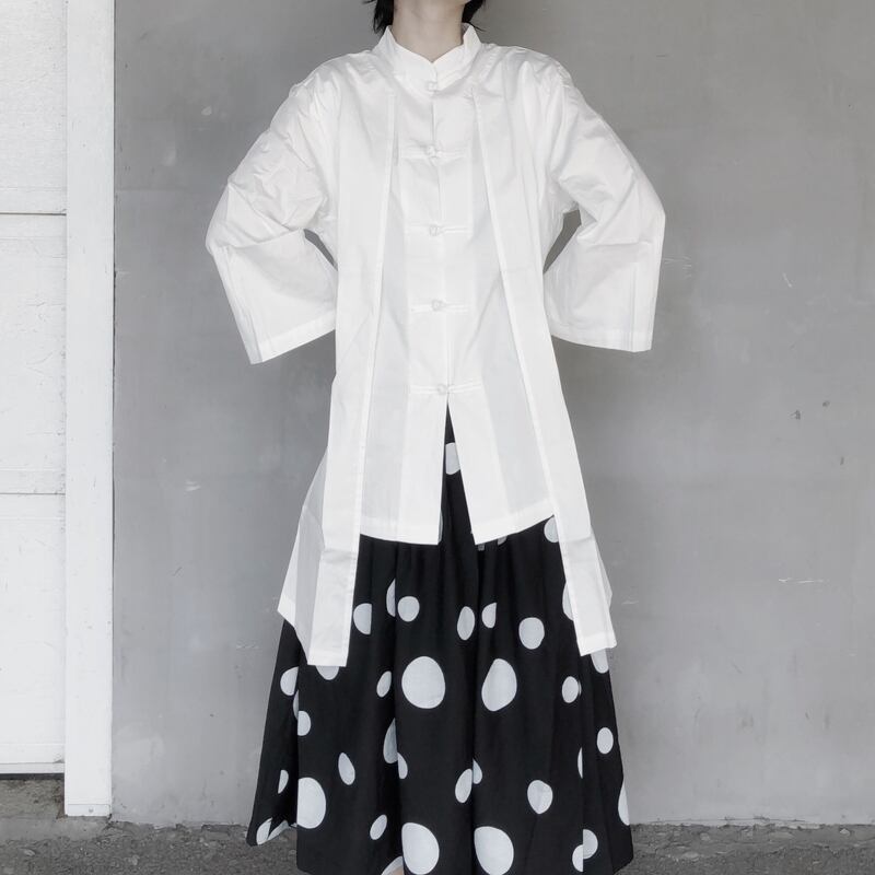 日本人デザイナー山本耀司テイストのシャツです。レトロな中華風留めボタンにマオカラーのシルエット、ロングシャツを羽織ったようなデザインのフェイクシャツです。