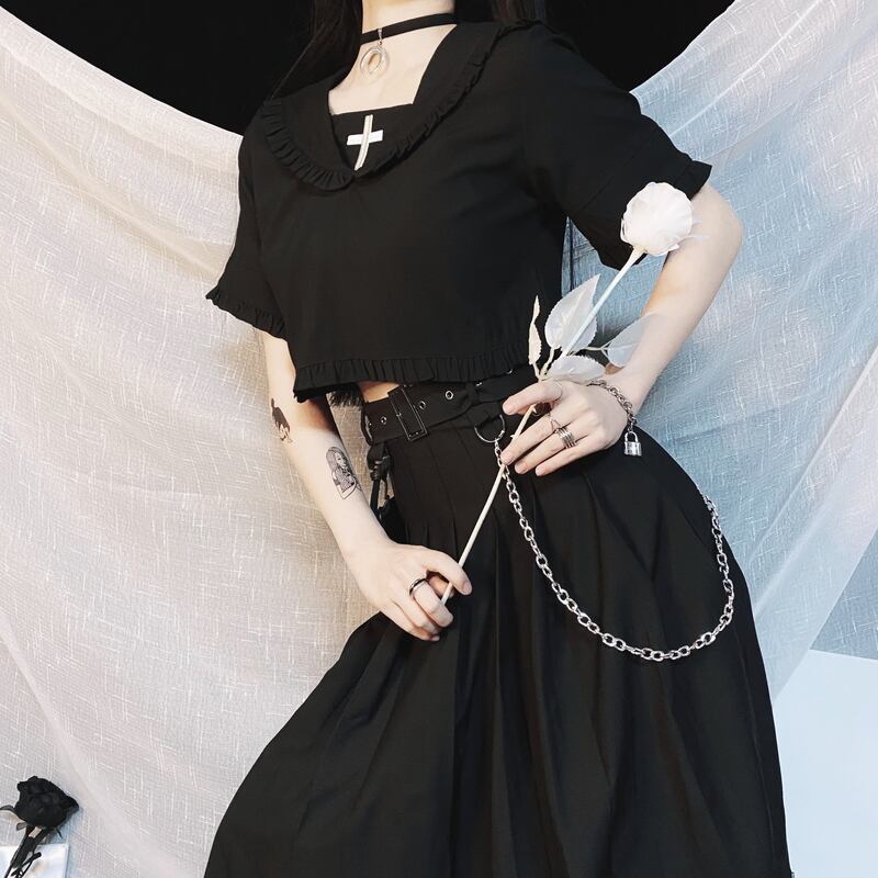 サブカル 服 地雷系 通販 ゴスロリ系 トップス セーラー服 Miub オリジナル ショート丈闇かわいい レトロ ハードガール 十字架 刺繍 ゴシック ロリータ