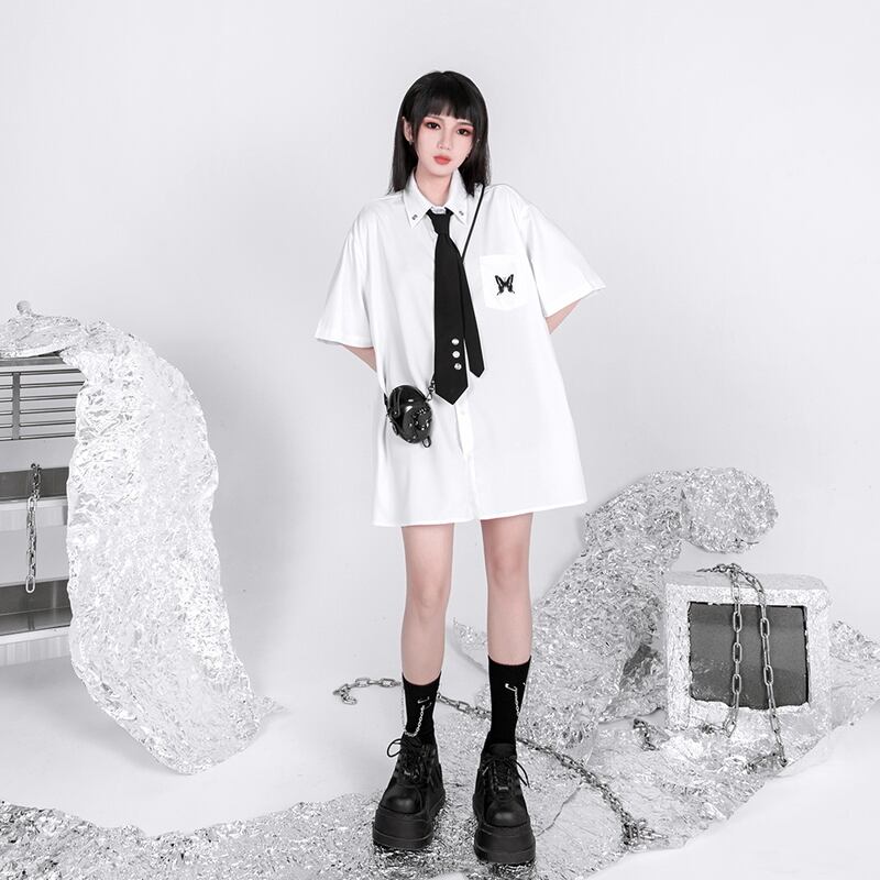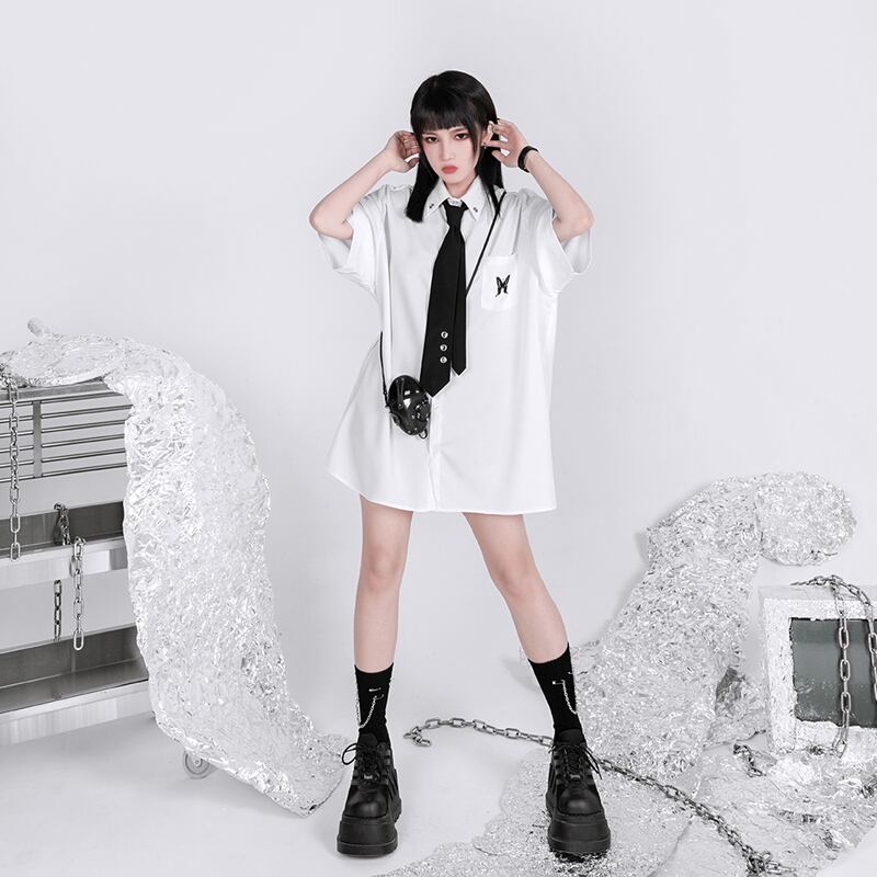 お手持ちの白シャツ、黒シャツにネクタイをするだけで病み可愛い印象に仕上がります。