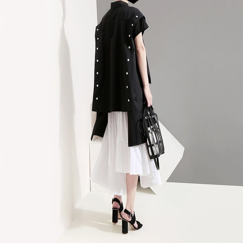 前後着丈の異なる異形デザインにフェイクボタンがインパクト抜群。両サイドがロング丈なのでヒップ回りもさり気なくカバーしてくれます。
