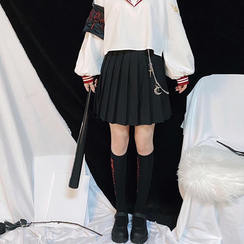 ハイウエストのプリーツスカートにサイドチェーンの十字架、三日月が病み可愛い。