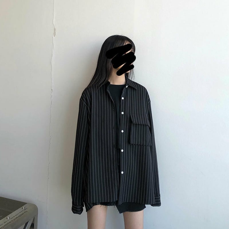 ピンストライプに大きめなフラップポケットがインパクト抜群な病み可愛いシャツです。