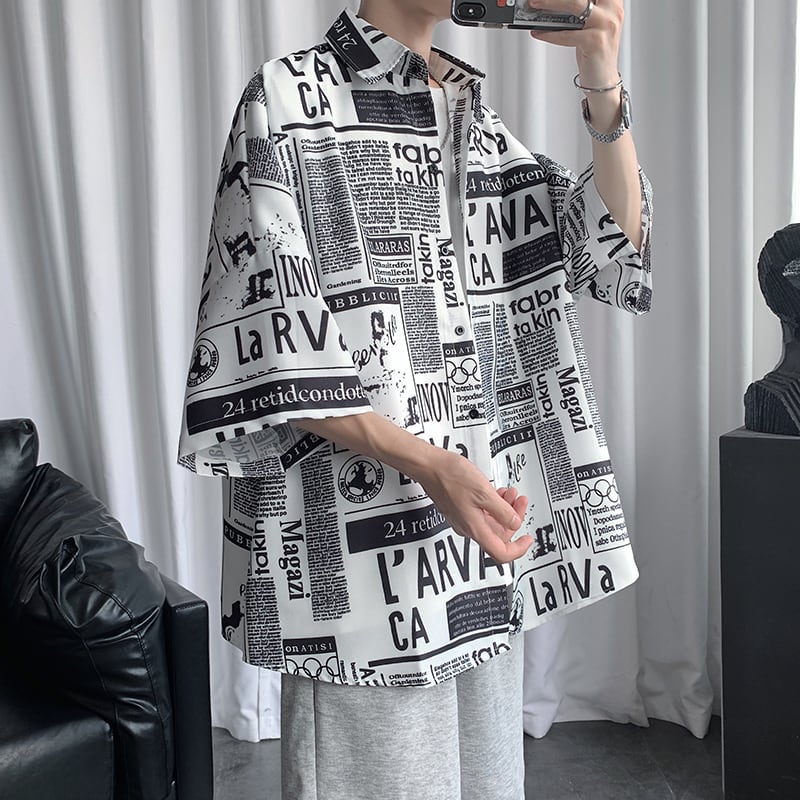 トレンドライクなニュースペーパー柄の半袖シャツです。