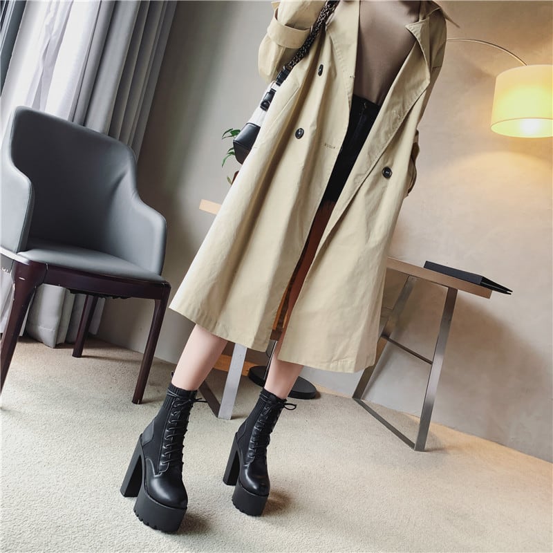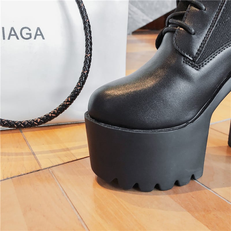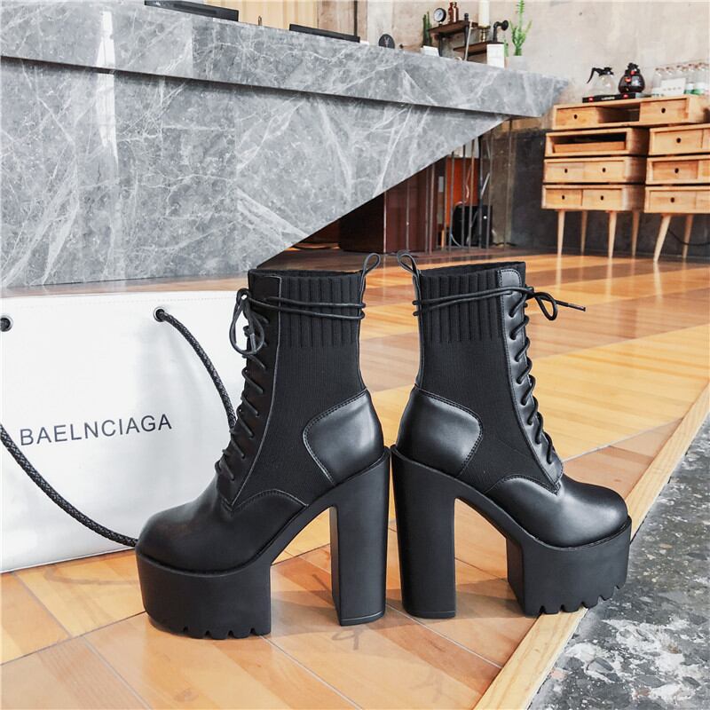 サブカル 服 地雷系 通販 超厚底靴 秋 ソックスブーツ ハイカット ラウンドフォルム PUレザー ヒール丈14.5cm つま先高5.0cm