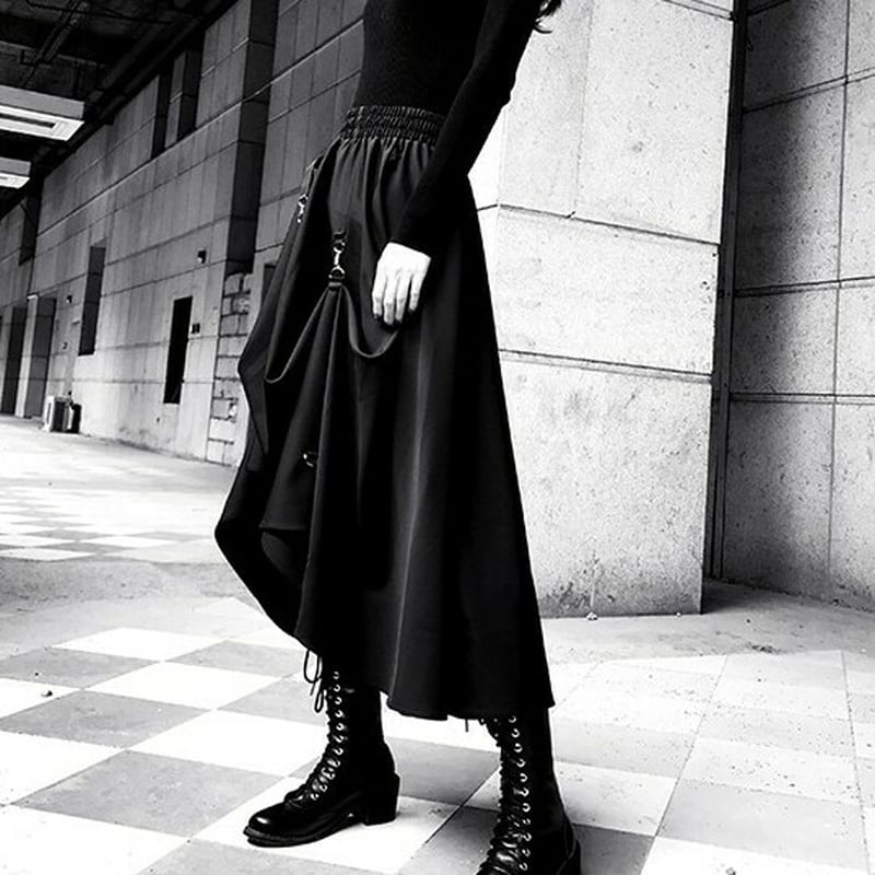 サブカル 服 地雷系 通販 モード系 スカート ロング丈 アシンメトリー カナビラ ドレープ 闇かわいい ハイウエスト Aライン