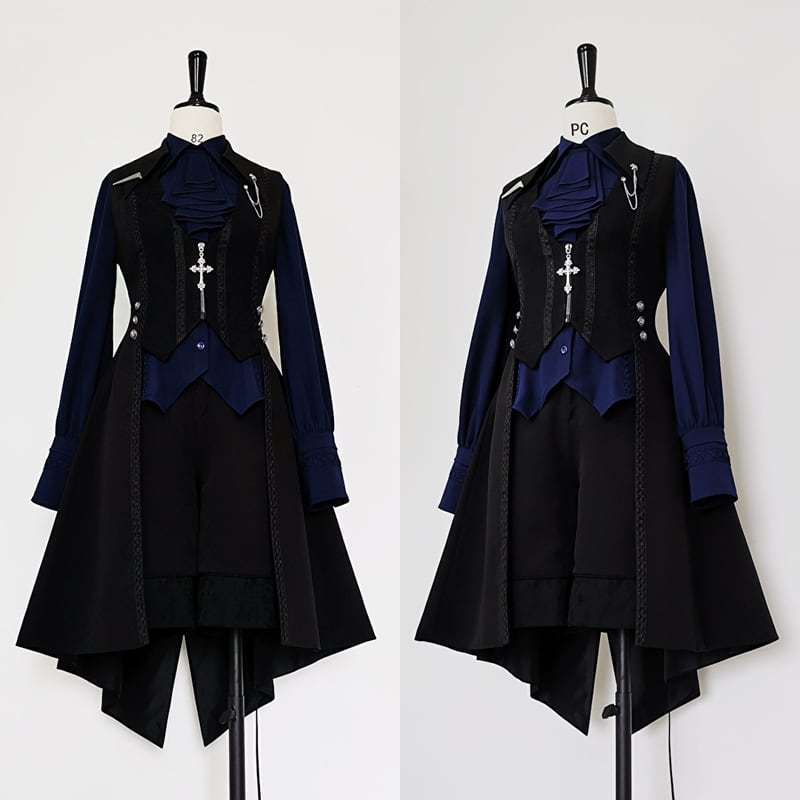 胸元のシルバー十字架がビジュアル抜群なロングベスト、ハイウエストなデザインにバックはセンターベンツの深い切れ込みとなっています。ゴシックなブラウスとコーデすれば病みかわいいゴスロリスタイルが格上げします。
