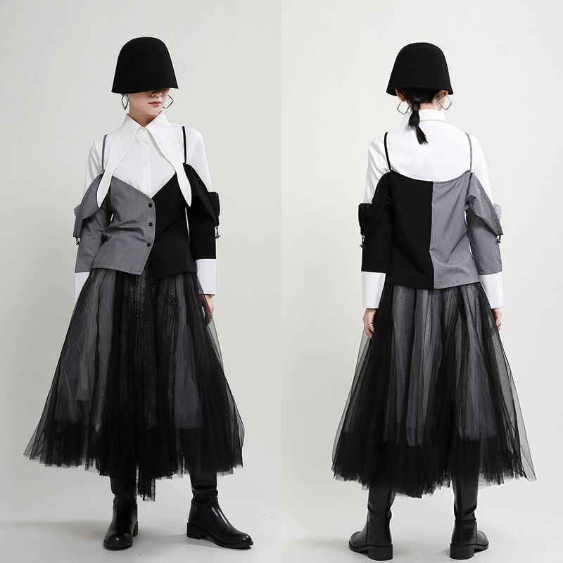 サブカル 服 地雷系 通販 モード系 シャツ ポインテッドカラー トップデザイン フェイクレイヤ 袖巾着シャツ 長袖 大人きれいめ バイカラー 白シャツ ゴシック ロリータ