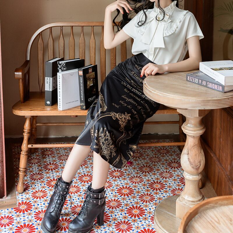 ハイウエスト、ロング丈にゴールドの英字ロゴが病みかわいいスカートです。