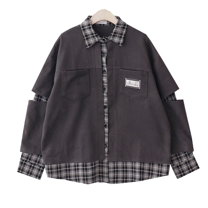 レトロなチェック柄シャツをレイヤしたようなトレンドデザインのフェイクスタイル。