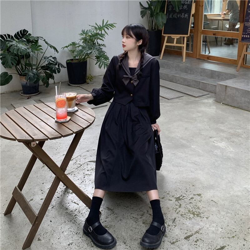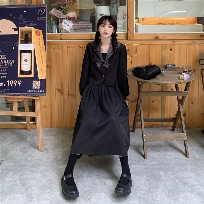 サブカル 服 地雷系 通販 ゴスロリ系 闇かわいい JKスタイル セーラー服 上下セット ボウタイトップス フレアスカート ハイウエスト Aライン ミモレ丈 韓国ファッション ゴシック ロリータ