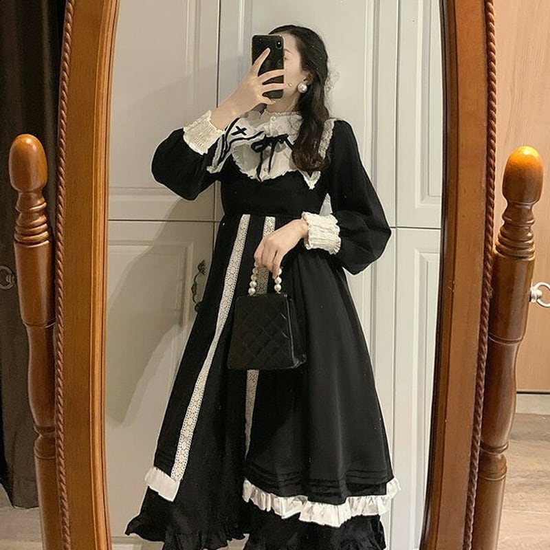 サブカル 服 地雷系 通販 ゴスロリ系 闇かわいい ワンピ ネックギャザー リボン 十字架 袖コン ハイウエスト ロング丈 ゴシック ロリータ