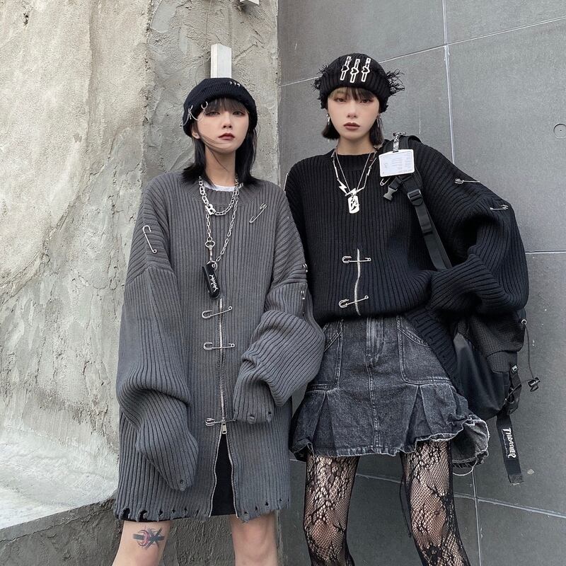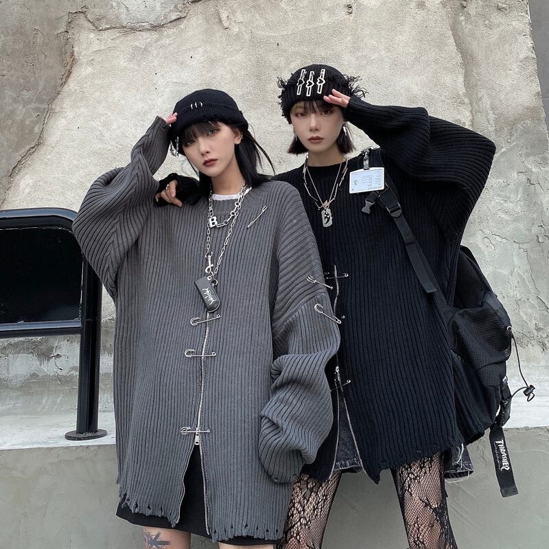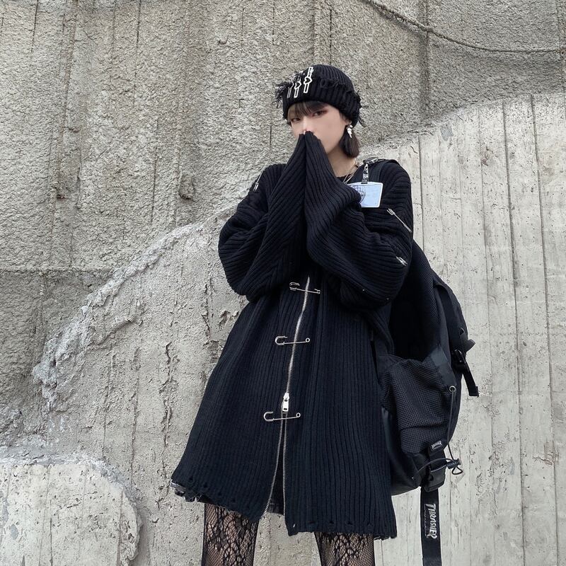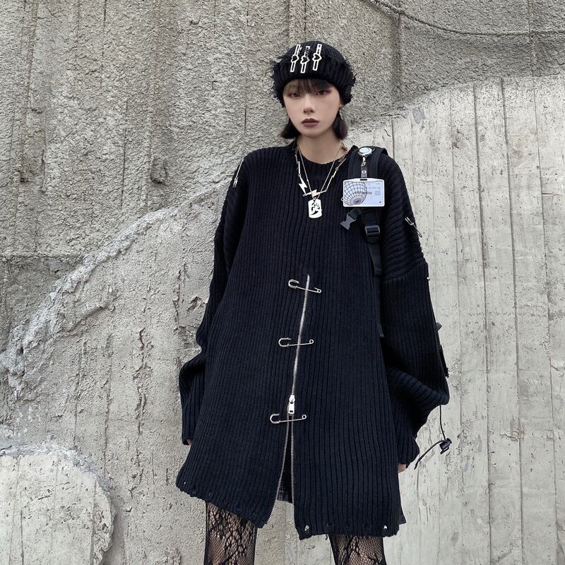 サブカル 服 地雷系 通販 ゴスロリ ニット プルオーバー ダメージ加工 ZIPアップ オーバーサイズ 闇かわいい V系 ゴシック ロリータ