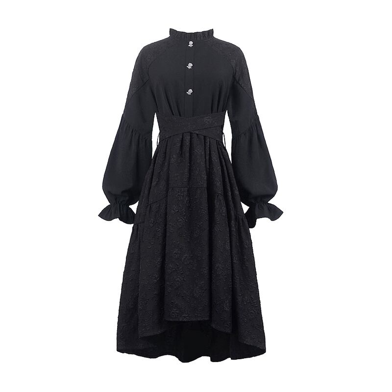 サブカル 服 地雷系 通販 ゴスロリ系 ワンピ ランタンスリーブ ハイウエスト ヘム丈 春服 黒コーデ 闇かわいい ブラック ホワイト ゴシック ロリータ