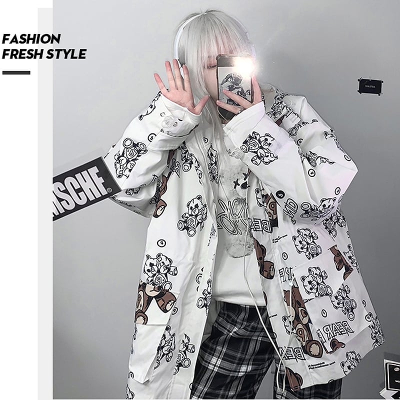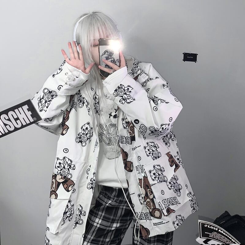 モノトーンカラーに差し色のクマちゃんが病み可愛い、ビッグシルエットのアウター