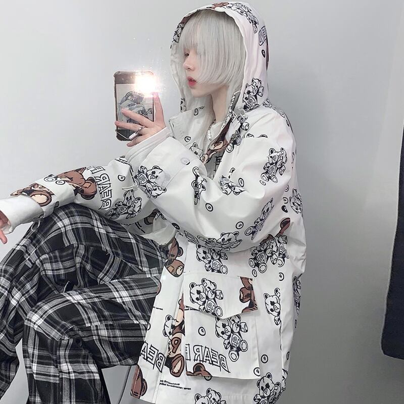 サブカル 服 地雷系 通販 ゴスロリ系 アウター ブルゾン 闇かわいい クマちゃん ZIPアップ パーカー ビッグシルエット 病みクマ ホワイト ゴシック ロリータ