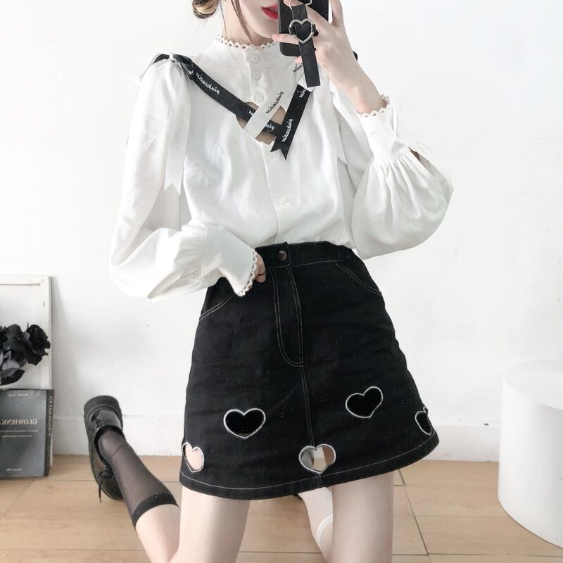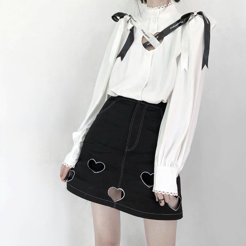 サブカル 服 地雷系 通販 ゴスロリ系 春服 JKスタイル ブラウス 長袖 ハート デコルテ リボン ネックフリル バルーンスリーブ 甘め ゴシック ロリータ