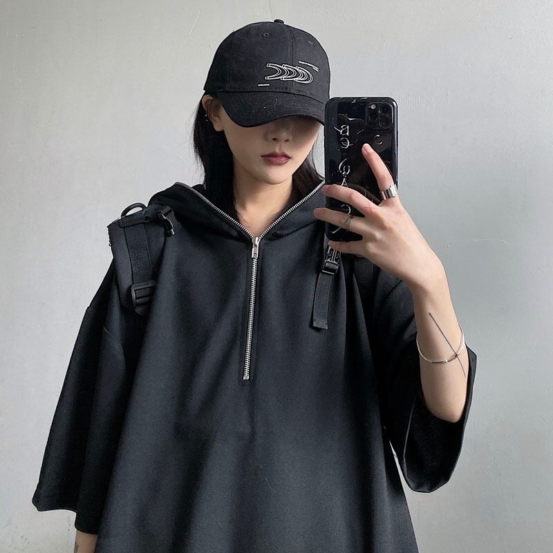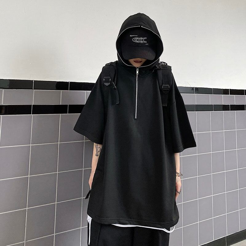 黒Tシャツとパーカーが合体したZIPプルオーバートップス半袖です。