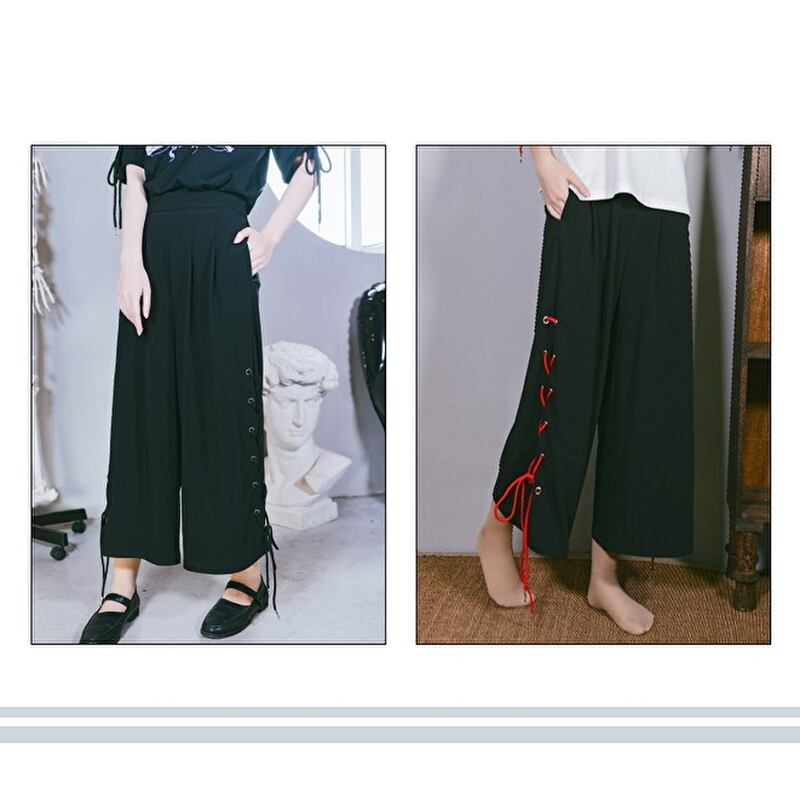 サイドレースアップが見ためのインパクト抜群なワイドパンツです。