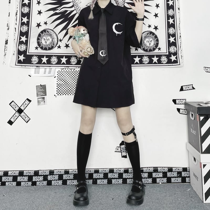 サブカル 服 地雷系 通販 ゴスロリ系 Miub オリジナルシャツ ネクタイ付き dark チェーン 十字架 三日月 ゴスロリ 黒シャツ ハードガール 闇かわいい ゴシック ロリータ