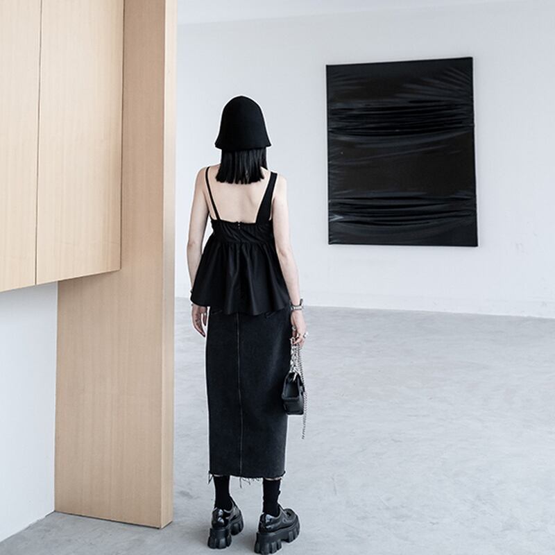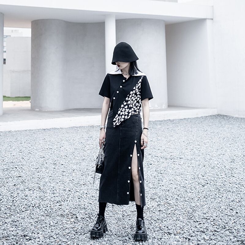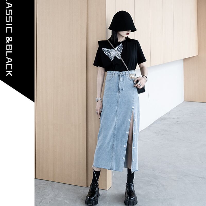 サブカル 服 地雷系 通販 モード系 春夏服 ロングスカート デニム 切りっぱなし サイドスリット 美脚 大人きれい ハイウエスト 黒ゴス おしゃれ ゴシック ロリータ