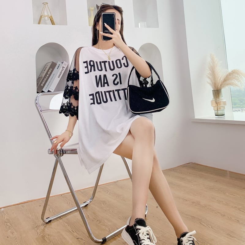 サブカル 服 地雷系 通販 夏T ゴスロリ Tシャツ 半袖 レース 透け感 ノースリーブ風 ロングT ビッグロゴ ブラック ホワイト カジュアル ゴシック ロリータ