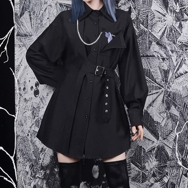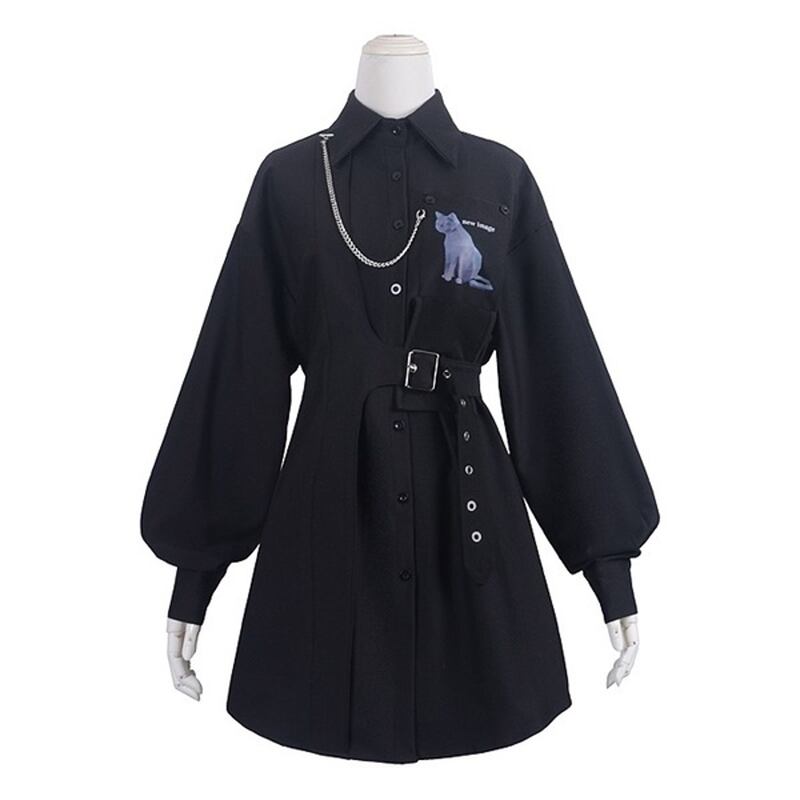 サブカル 服 地雷系 通販 ゴスロリ ロングシャツ ウエストベルト キャットプリント 2Way 闇かわいい チェーン