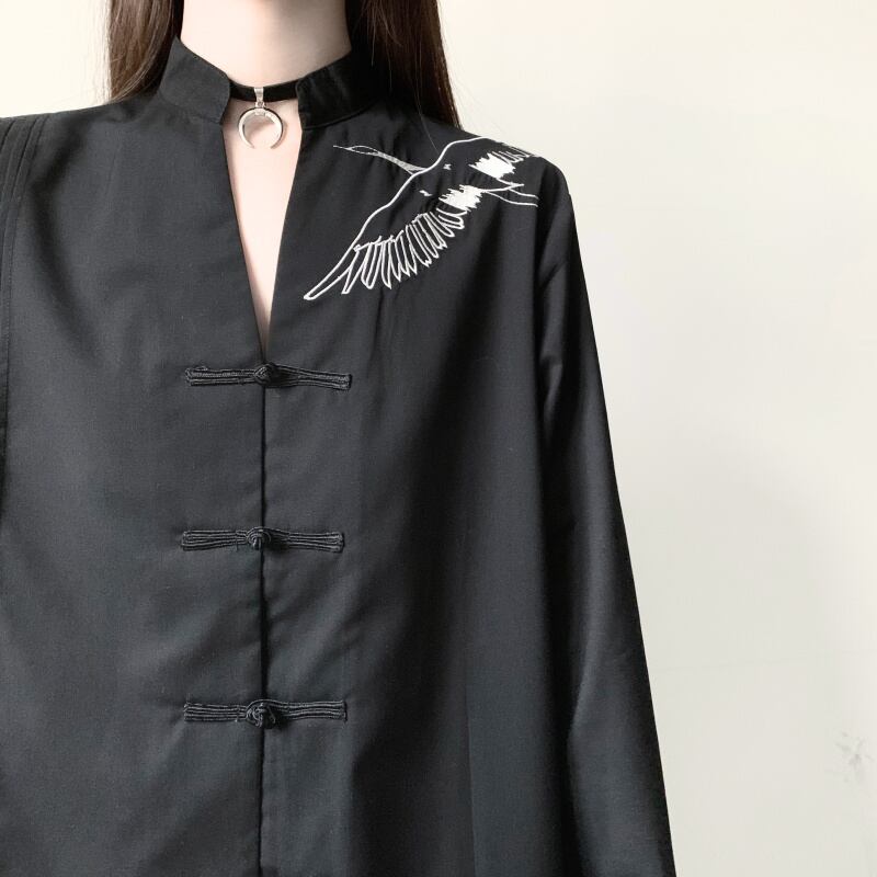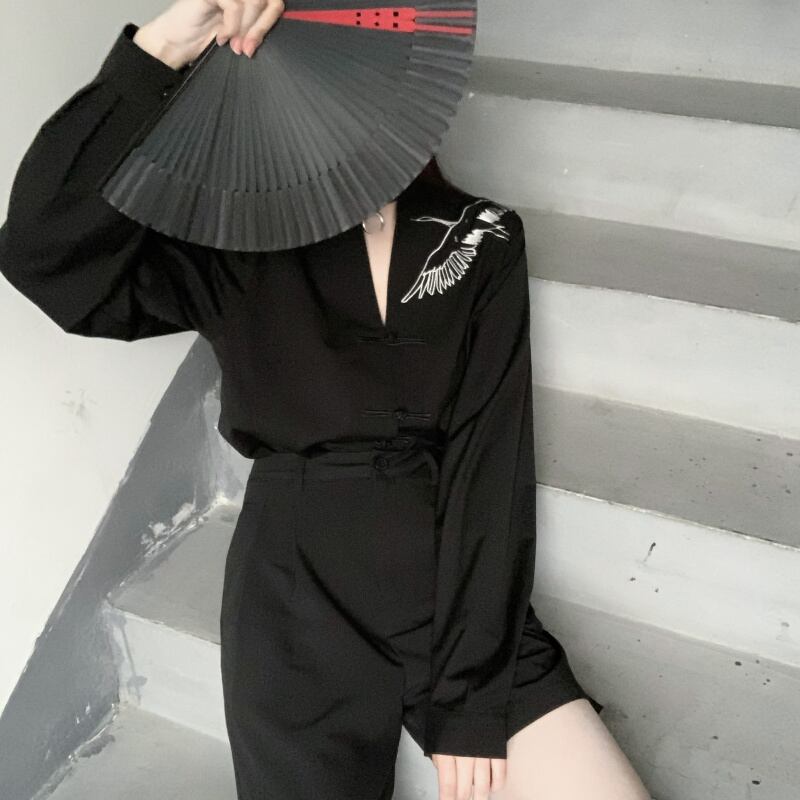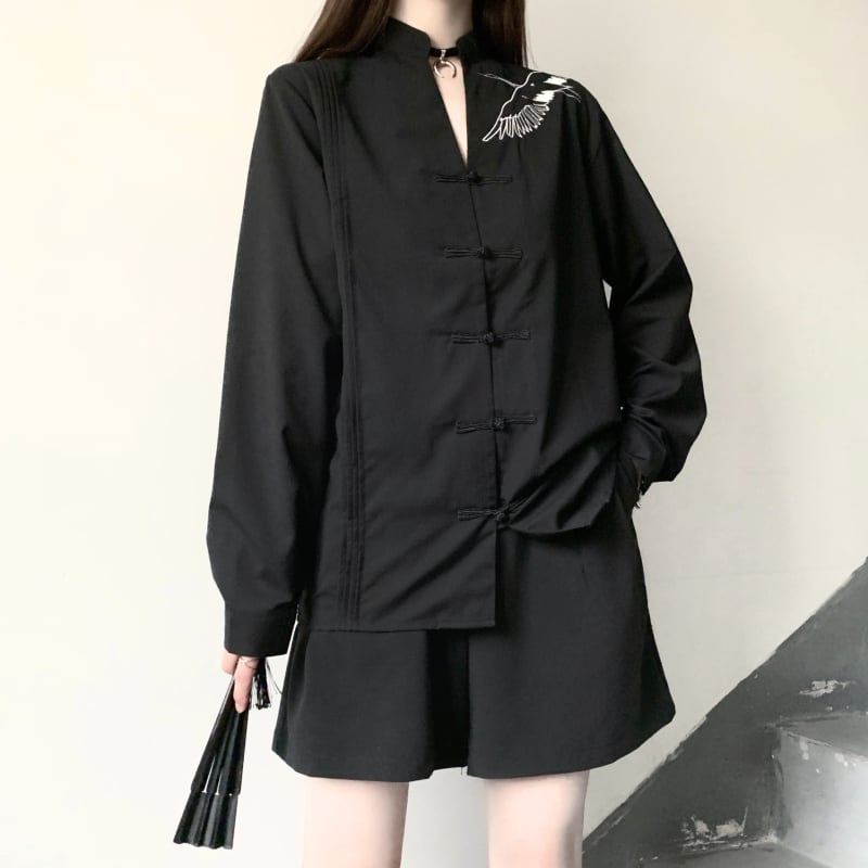 黒シャツはチャイナボタンにショルダーの鶴がおしゃれ。