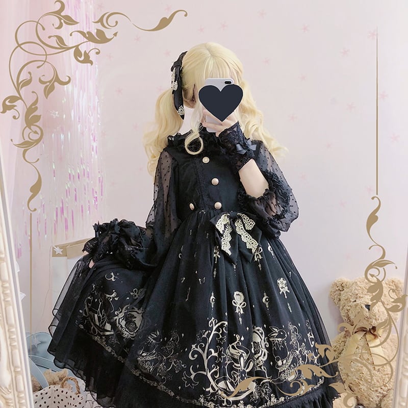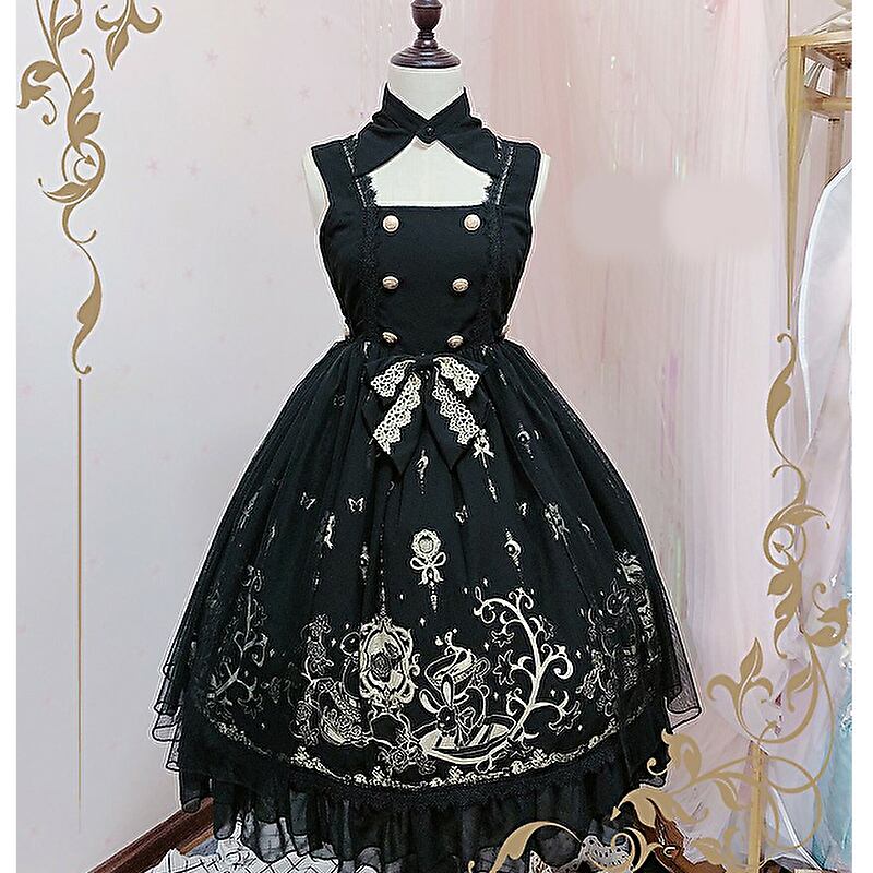 サブカル 服 地雷系 通販 ロリータ JSK クラロリ ワンピ サスペンダースカート薔薇 ねこ プリント レース フリル ふんわり 闇かわいい ゴシック