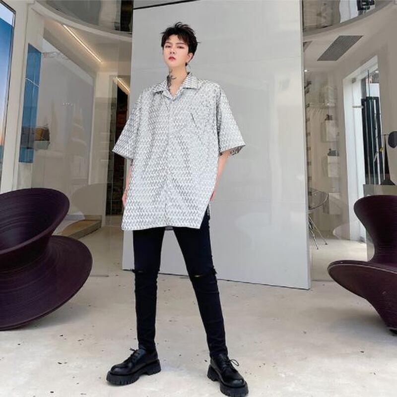 光沢感があり、ウェーブ模様のオーバーサイズシャツ、シャツインでもアウトでもクールなメンズスタイルを叶えてくれます。